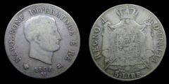 Obv.: NAPOLEONE IMPERATORE E RE. Below, 1808 and M in two lines, between pomegranate and oil lamp. Rev.: Napoleonic coat of arms. Around: REGNO D'ITALIA. Below, 5. LIRE Mm. 37, grs. 25 |