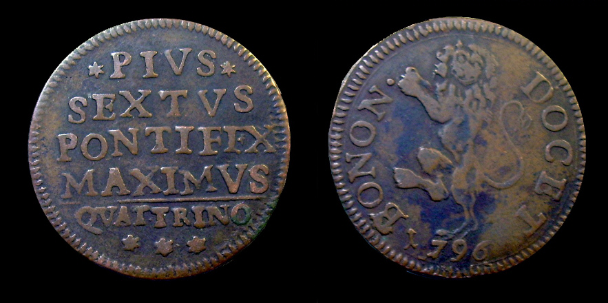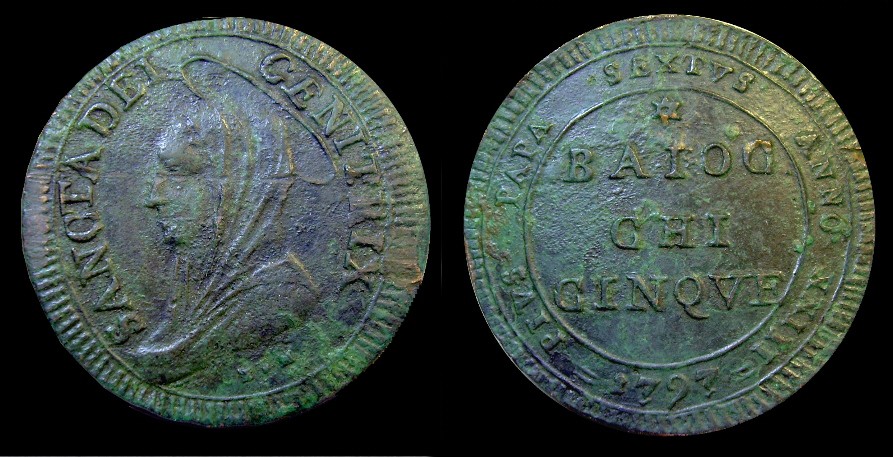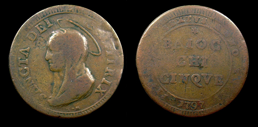 Rev.: In the field: BAIOC CINQVE VITERBO on three lines; Around: PIVS PAPA SEXTVS ANNO XXIII 1797