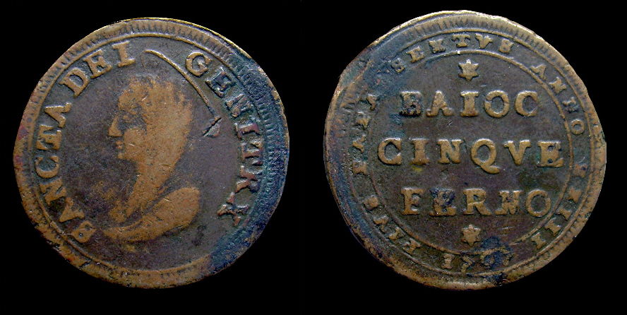Rev.: In the field: * BAIOC CINQVE CIVITA VECCHIA in four lines; above, a star. Around: PIVS PAPA SEXTVS ANNO XXIII 1797