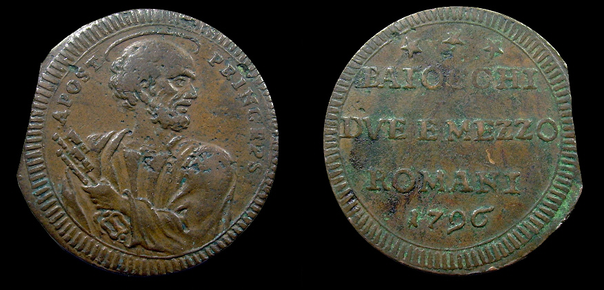 Rev.: BAIOCCHI DUE E MEZZO ROMANI 1796 in four lines. Above: three stars