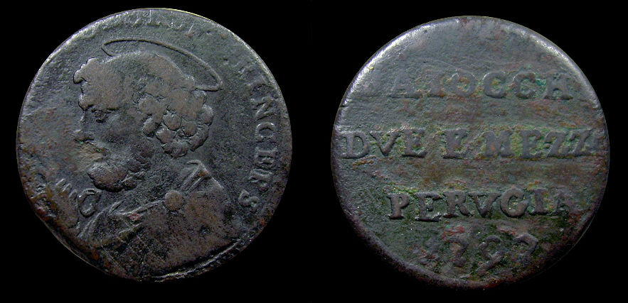 Rev.: BAIOCCHI DUE E MEZZO PERVGIA 1797 in four lines. Above: three stars