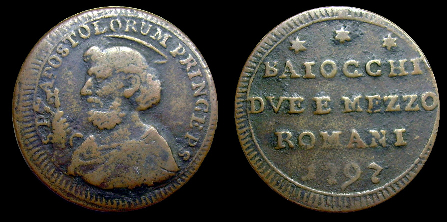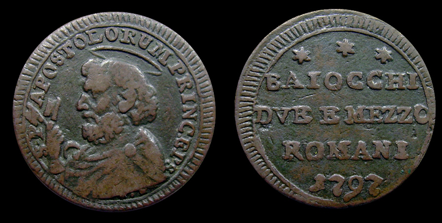 Rev.: BAIOCCHI DUE E MEZZO CIVITA VECCHIA 1797 in five lines. Above: three stars
