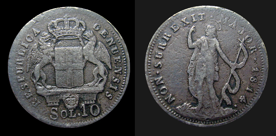 Obv.: Crowned coat of arms between two gryphons. Around, RESPUBLICA GENUENSIS. Below, SOL. 10 Rev.: St. John the Baptist standing with standard. Around: NON . SURREXIT . MAJOR . 1814 . Mm. 18, grs. 2,10 |