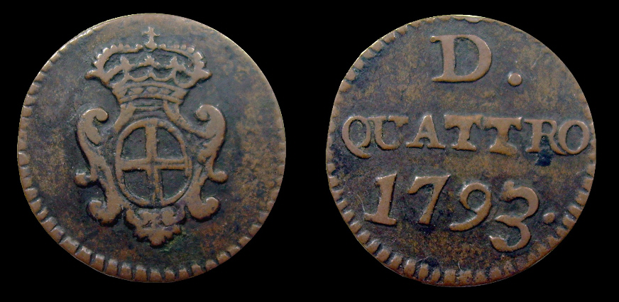 Obv.: Crowned coat of arms Rev.: D. QUATTRO 1793 in three lines Mm. 18, grs. 2,19 |