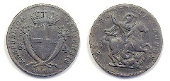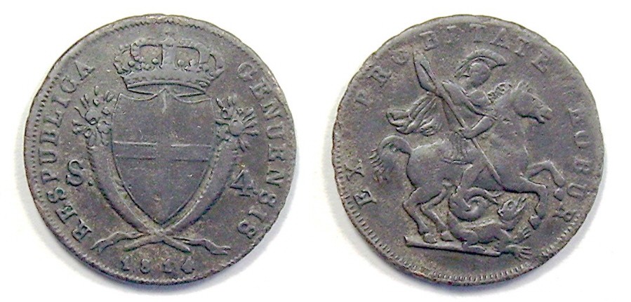 Obv.: Crowned coat of arms between cornucopiae and S. 4. Around, RESPUBLICA GENUENSIS. Below, 1814 Rev.: St. George horseback right, killing the dragon. Around, EX PROBITATE ROBUR Mm. 21, grs. 4,39 |